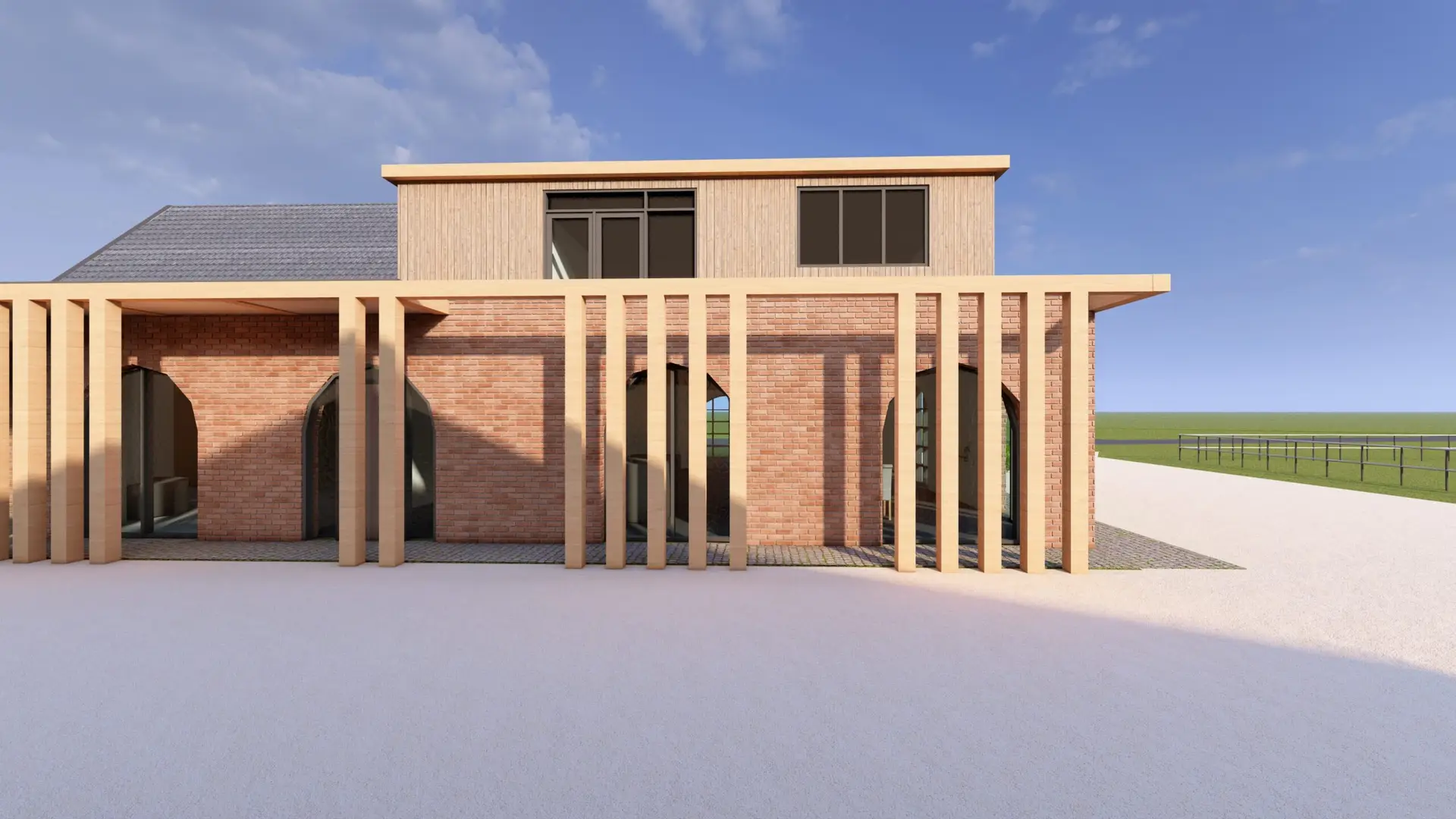 De toogramen vormen een karakteristiek en verbindend element binnen het ontwerp. Geïnspireerd op de vormtaal van historische paardenhouderijen en stallen, brengen zij ritme en herkenbaarheid in de gevel. In het oorspronkelijke gedeelte zijn brede toogramen met een klassieke roedeverdeling toegepast, terwijl het nieuwe volume een meer verfijnde, minimalistische variant kreeg met slanke profielen en grote glaspartijen.